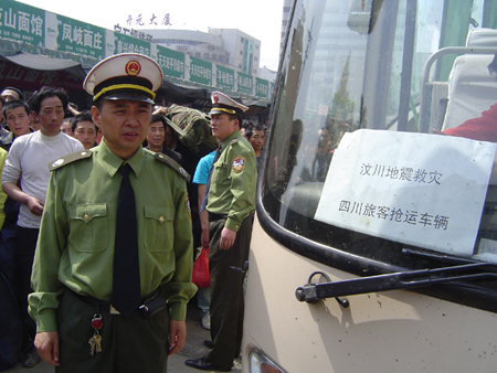 汶川大地震以来,由于宝成铁路中断,自5月13日开始,大批去往四川广元、锦阳方向的旅客滞留宝鸡。宝鸡市交通、运管部门及运输企业全力投入抢运旅客返川,截止5月14日14时,共发送客车106辆,运送旅客2933人。