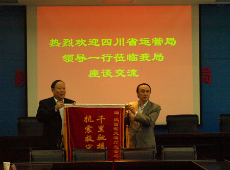 10月21日,四川省交通厅公路运输管理局任胜平副局长率队专程来我局答谢陕西道路运输部门在抗震救灾工作中对四川道路运输部门的大力支持和帮助,并送上“千里驰援解危难,抗震救灾显真情”的锦旗。吕东昌局长代表我局接受了锦旗,并对任胜平副局长一行的到来表示热烈欢迎。