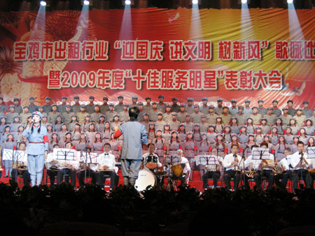 9月16日下午,宝鸡市出租汽车行业“迎国庆、讲文明、树新风”歌咏比赛暨“十佳服务明星”表彰大会隆重举行。2000多个座位的礼堂座无虚席,平日手握方向盘的“的哥的姐”们欢聚一堂,用高吭豪迈的歌声歌颂伟大祖国,庆祝伟大祖国60周年华诞。市委常委、政法委书记乌永陶、市政协副主席张望、省运管局张江怀纪委书记等同志出席了歌咏比赛和表彰大会,并为获胜者颁奖。会上,宝鸡市交通局和市文明办还联合表彰了2009年度出租汽车行业“十佳服务明星”。