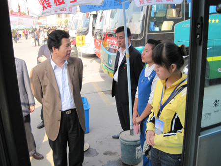 座谈中,李永民副厅长指出,今年“十一”黄金周适逢建国60周年大庆,假日时间长,出行旅客多,对全省道路运输行业安全生产、安保防恐工作是一次检阅和考验,在这一特殊时段,各级交通运输部门一是要充分认识当前各项工作面临的严峻形势,坚决克服麻痹松懈思想,把安全稳定工作放在重中之重的首要位置抓实抓好;二是道路客运企业要进一步加快清理车辆挂靠工作进度,切实强化对营运驾驶员的日常管理,确保安全生产工作不在“人”的环节出现纰漏,不断向现代运输企业的管理模式迈进,向民航企业的先进管理理念看齐;三是强化措施,夯实责任,严格落实“三不进站五不出站”制度,严查重处超员超载、私抬票价等侵犯旅客权益的违规违法行为,对营运车辆技术状况进行认真排查,确保车况良好。密切关注防控甲流工作形势,提早制定有效的应对措施;四是节日期间要坚持领导带班,坚守岗位,靠前指挥,值班人员工作职责要明确落实,积极稳妥有效处理好各类突发应急事件,确保广大人民群众渡过一个安全、舒适、祥和的国庆佳节。刘三刚局长结合李永民副厅长指示精神提出三点要求,一是在安保防恐工作中要注重细节,对重点部位、重点人群要重点防范,进一步建立健全各类应急预案,有效有序应对各类突发事件;二是各运输企业、客运站场要有效发挥GPS监控系统、安检仪等安全设备的作用,提升安全监管的科技含量;三是要切实搞好“十一”黄金周的运输组织工作,储备充足运力,提升服务质量,确保旅客不滞留。