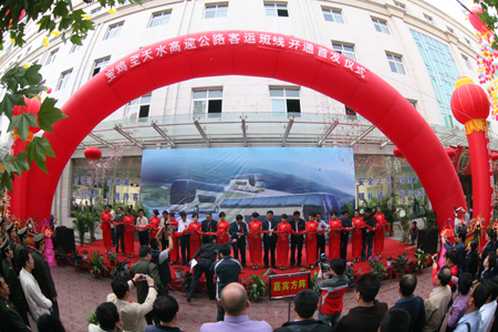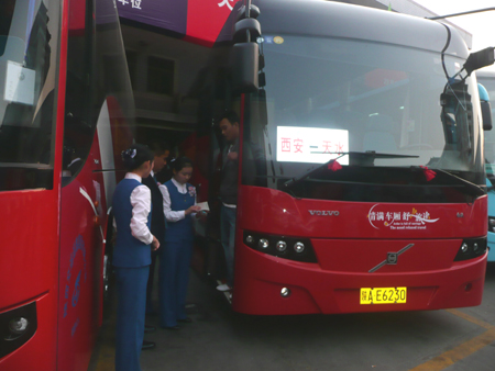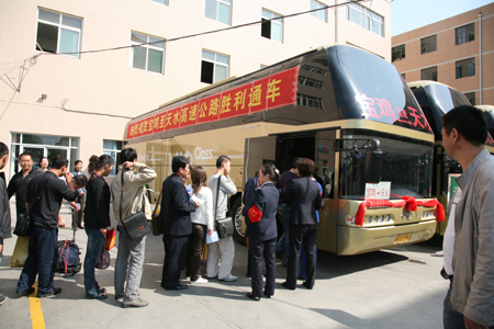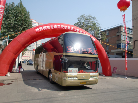 9月28日,宝鸡至天水、西安至天水高速客运班线随着宝天高速公路的建成竣工正式开通运营。此两条高速客运班线的开通,大大缩短了陕甘两省的道路运输距离,是我省道路运输部门认真落实省委、省政府构建西部强省号召,切实践行省交通运输厅“发展现代交通,奉献一流服务”要求的重大举措,对实现国家规划的“关中天水经济圈”以及整个西北地区的经济社会发展具有非常重要的战略意义。同时投放大型高档次客车,提供航空式服务,实行规范化经营,将极大地满足西安、宝鸡、天水三市群众方便、快捷、舒适的出行需求,对促进三市乃至两省的人员、经济、文化交流将发挥重大作用。陕甘两省运管机构、客运企业以自己的实际行动为建国60周年献上了一份厚礼。