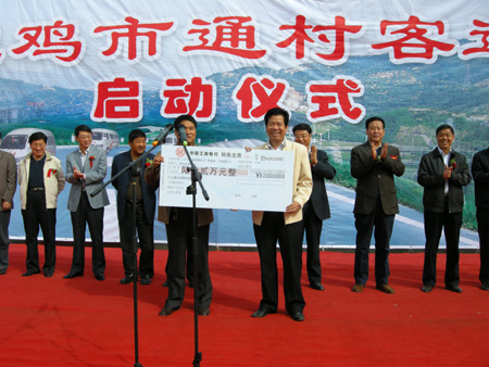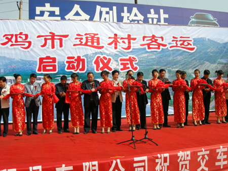 10月20日,宝鸡市在陈仓区隆重举行通村客运启动仪式,省交通运输厅李永民副厅长、运输处吕东昌处长、省运管局李抗美副局长,宝鸡市张敬原副市长、市政府张长生副秘书长、市交通局商宝庆局长以及各县区的有关领导出席了启动仪式。在通村客运启动仪式上,陈仓区虢镇至坡子村、虢镇至油坊村、县功镇至谢家崖村、虢镇至光明村和虢镇至曹家沟等5条通村客运线路开通,31辆标识统一的14座通村客运车辆正式投入运营。这些通村线路的开通,对方便当地群众出行,促进农民群众致富增收,加快陈仓区农村经济社会发展都将起到积极的推动作用。