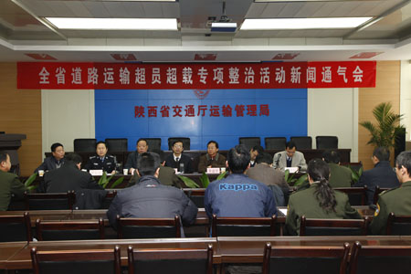 为加强冬季道路运输安全管理,严厉打击道路运输车辆超员超载等违法行为,及时消除安全隐患,预防和减少道路交通事故,保障广大人民生命财产安全,确保道路客运安全和货运源头治理超限超载工作任务的顺利完成,陕西省打击“黑车”非法经营联合执法领导小组办公室决定在全省开展一次打击道路运输车辆超员超载非法经营专项整治活动(2009年12月25日至2010年4月3日)。2009年12月25日,厅运管局联合省公安交警部门召开道路运输车辆超员超载百日专项整治行动新闻通气会。省交通运输厅道路运输与客运管理处吕东昌处长、治超办高振鑫副主任、厅运管局刘三刚局长、龙浩仔副局长、张江怀纪委书记、省公安厅交通管理局牛金平处长、省公安厅治安管理局罗宽亮副处长等出席了会议,省内有关媒体对此活动进行了报道。