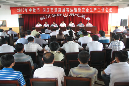 9月20日,铜川市交通局、铜川市运管处组织召开了2010年中秋节、国庆节道路旅客运输暨安全生产工作会议。 会议传达了交通部、省安委会有关文件精神,学习了市交通局《关于做好2010年中秋、国庆期间全市道路运输和安全保畅工作的通知》,通报了全市道路运输安全检查和出租车专项整治情况。会议强调:一是安全成绩不宣传。要充分认识交通安全工作的严峻性、偶发性,多做有利于安全的事实,少做表面文章,狠抓工作落实。二是交通工作不松懈。安全工作要做到时时抓、天天抓、月月抓、年年抓。三是安全责任不推卸。要切实肩负起道路运输安全管理和工作责任,确保道路运输行业安全发展。