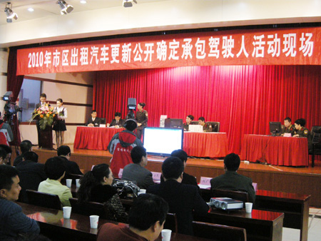 近日,宝鸡市举行2010年市区出租汽车更新公开确定承包驾驶人活动,通过现场摇号确定2010年出租汽车承包驾驶人,随着现场抽取的摇号嘉宾轻点鼠标,400名出租车承包驾驶人分10组依次产生。