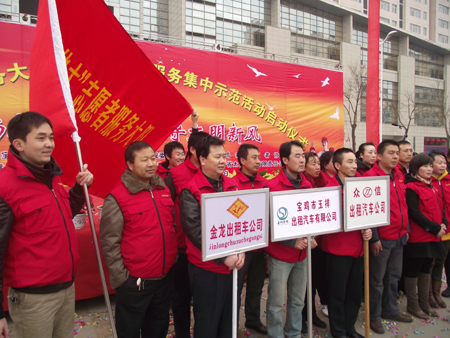 宝鸡市出租车协会从10家公司挑选了50名素质高,表现好的驾驶员组建了“爱心的士”志愿者服务大队,并接受了志愿者服务大队大旗。计划今年主动承担中、高考期间免费接送考生的义务,并引领全行业积极参与。进一步弘扬“团结、友爱、奉献、进步”的志愿者精神,打造品牌、树立形象、展示风采、服务宝鸡。
