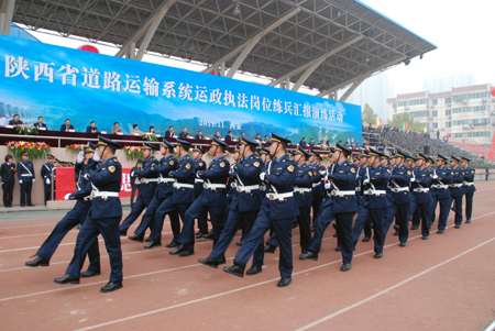全省道路运输系统运政执法岗位练兵汇报演练活动开始令由冯西宁厅长亲自下达。14个市级运管机构方阵700余名运政人员以饱满的精神面貌,威武雄壮的依次正步走过观礼台前接受领导检阅。由陕北、关中、陕南的四支队列组成200人方阵进行了交通指挥手势信号展示。客运站场、源头治超、出租汽车等三个规范执法展示科目,通过不同角度生动形象的展示了运政人员规范执法,文明执法的良好素质。最后,向在11月1日全省道路运政执法岗位练兵比武竞赛中获一等奖的延安市运管处,获二等奖的延安市城客办、咸阳市运管处,获三等奖的西安市出租处、宝鸡市运管处、安康市运管处和获得优秀组织奖的西安市运管处、渭南市城客处颁发了荣誉奖杯。
