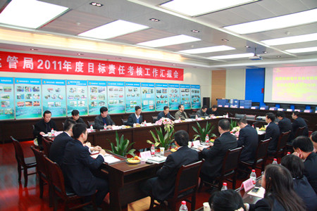 2011年12月2日,由驻厅纪检组组长王世英、厅总会计师李峥嵘带队的省厅第二考核组一行8人,对厅运管局2011年度目标责任完成情况进行了全面认真细致地考核。按照考核安排,李峥嵘总会计师作考核动员讲话后,刘三刚局长围绕公司化改造、通村客运、源头治超、货运物流、站场建设、节能减排、党风廉政及精神文明建设等重点工作向考核组汇报了2011年度目标任务完成情况,并就运政执法岗位练兵、法规知识竞赛、大荔县农村交通物流、世园会期间运输保畅等亮点工作及2012年道路运输工作的总体思路与目标进行了介绍。潘绍忠党委书记就加强党风廉政、队伍建设、精神文明、行风建设以及职工后勤保障等方面采取的措施进行了补充汇报。随后,考核组对局领导班子进行了民主测评,对照目标责任内容仔细查看了局年度目标责任完成情况相关佐证资料, 并参观了局活动室、阅览室和职工食堂。