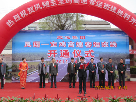 4月1日,凤翔至宝鸡高速客运班线正式开通,班线全长48公里,首期投放中型高一级依维柯客车9辆,运营时间为7:00——19:00,20分钟发一班,全程运行需50分钟左右。该高速班线客运车辆由宝运集团全额投资,采用“公车公营”方式运营。凤宝高速客运班线的开通,对改善凤翔的交通运输结构,引领班线客运公司化经营,及广大人民群众快捷乘车将起到十分重要的作用。