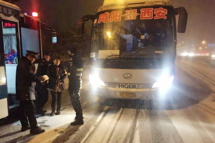 1月3日,为了确保旅客出行安全,西安市运管处执法人员顶风冒雪坚守工作一线,连夜检查客运车辆雪天行车应急措施,由于客运站部分班线停运,运政人员积极配合工作人员疏导秩序,防止旅客滞留。