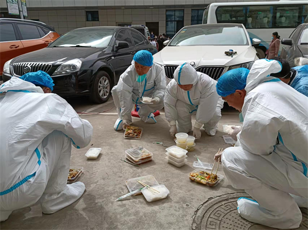 自宝鸡市开展大范围全员核酸检测以来,我们的核酸检测样本的转运人员就开始奔向各个社区服务站、隔离酒店、核酸采集点取样本送往检测地点。第一天5点40就到位了,穿着防护服非常辛苦;最忙的时候,甚至到战斗到凌晨两点多,来回要取送7—8趟。到了饭点,也只是随便扒几口就马不停蹄地投入工作,为了减免脱换防护服频次,大家尽量不喝水。一天下来,他们都奔波在转运途中,防护服里面的衣服都湿透了,双手也被捂得发白。特别一提的是我们的驾驶员了解到部分负责交接核酸检测样的医护人员集宿地较远且出行不便,还主动承担了接送她们的任务。