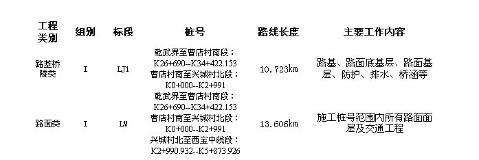 (2)招标范围:本项目本次施工招标设路基桥隧类、路面类2个类别2个组别2个标段,具体标段划分及主要工程内容如下:
