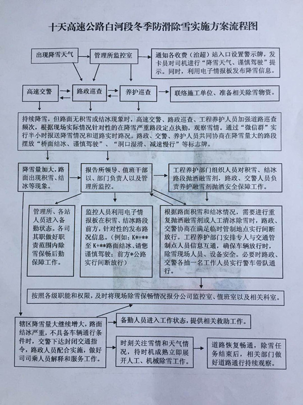 二是定“行动指南”。根据山区道路下坡路段和弯道路段多的特点,提前制定了冬季除雪防滑应急预案和雪天发生事故的处理预案,做到早准备、早部署、早排查,切实抓紧抓实抓好冬季安全生产,确保应急救援工作的高效有序开展。