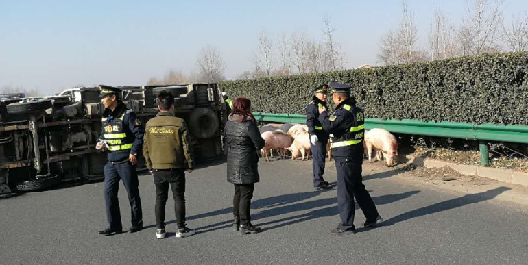 到达现场后,路政人员紧急处理,引导过往车辆紧急避让,在路面上立即摆放安全标志,对占用车道进行了封闭。随后中队增援人员赶到,将分散的猪全部赶回安全区域。半小时后,当事司机联系的转运车辆到达现场,路警人员帮助司机将猪装到了该转运车上。