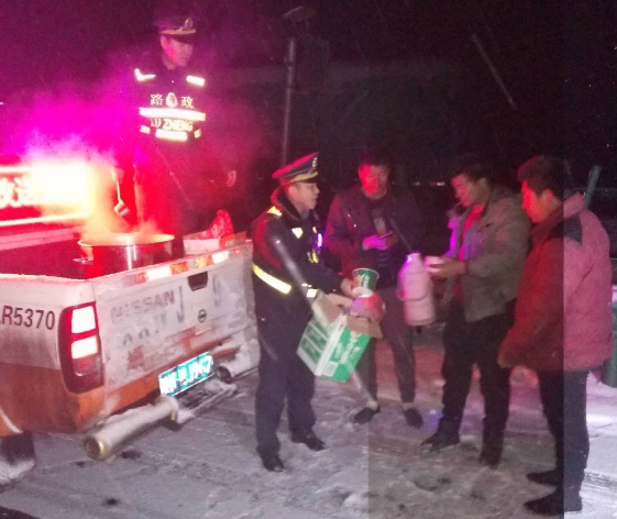 1月6日晚,吴堡路政中队路政执法人员冒着严寒大雪,上路为滞留在陕晋界主线收费站的82辆车司乘人员送上热水、方便面等物品。
