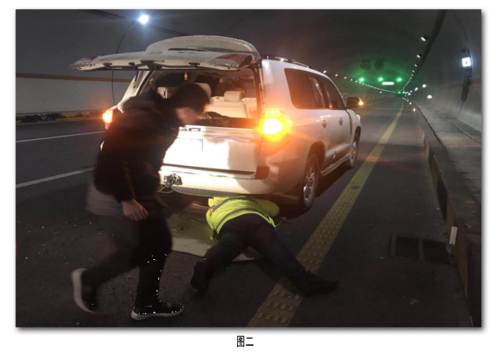 画面二:延安西路政中队人员为车主更换防滑链。1月7日晚,中队途经骆驼卯隧道时,发现一辆小轿车停在隧道内无法行驶,询问得知由于车辆安装的防滑链忽然断裂,断裂的防滑链缠在车轮毂上导致车辆无法行驶,看到此情况,路政人员在车后设置好安全警示标志,扑下身子钻到故障车下,熟练使用各类工具清除断裂防滑链,经过10分钟的救援,受损防滑链被清除。