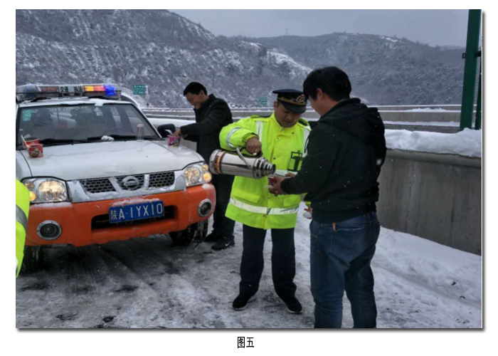 画面五:黄延高速路政人员为司乘人员送温暖。大雪无情人有情。为了让过境的司乘人员感受到高速人的温暖,1月3至8日,黄延高速路政人员开展不间断送温暖活动,给滞留在路上的司乘人员送去热水、鸡蛋、蒸馍、咸菜、方便面、火腿肠等便捷食物,让他们堵车不堵心,充分展示路政人员的热情服务。
