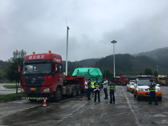 接报后,汉中路政执法支队立即组织路政管理科和直属大队迅速赶往违法地点进行核查。执法人员到达天汉水城服务区后,对该车的《超限运输车辆通行证》《监护方案》等进行了核查,并进行了比对,发现该大件运输车辆确有存在未按审批路线行驶的违法行为。