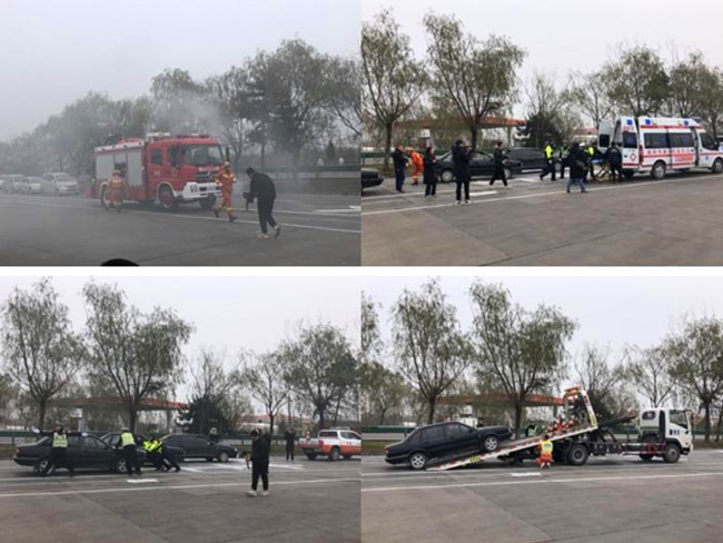 上午10时许,随着演练总指挥的一声令下,演习正式开始:监控人员通过视频巡查发现马庄西立交至西张堡收费站路段出现团雾严重,导致部分车辆滞留,监控人员立即通知辖区路政人员前往现场查看,确认因团雾严重,导致三辆车发生追尾事故,占用全部车道,道路出现拥堵。10时10分,监控人员立即将此情况上报有关值班人员和监控中心,同时立即启动恶劣天气公路保畅专项应急预案。一是迅速紧急组织消防、救护、施救、养护等部门前往现场处置,同时拨打“120”急救电话救治伤员;二是将道路拥堵情况通报相关分公司和省交通集团应急监控中心,请各分公司做好应急协助工作,通过远端分流缓解事故路段通行压力,避免次生事故发生;三是迅速配合消防人员立即解救被困伤员,并将伤员由救护车转运到附近医院进行救治;四是路政、交警迅速对现场勘察,做好记录,并请施救人员快速将事故车辆拖离,养护人员清理现场,同时对滞留车辆由交警、路政联合采取压速带道的方式护送至附近收费站驶出,确保人员生命财产安全。经过一个小时的应急处置,团雾逐渐消散,能见度达到通行条件,立即解除应急响应,快速恢复道路通行,至此演练顺利圆满结束。