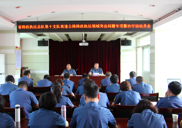 为深入贯彻落实交通运输部和省厅关于交通运输执法领域突出问题专项整治行动工作部署,根据省路政执法总队统一安排,5月24日上午,省路政执法总队第十支队召开专题会议,传达学习交通运输部、省交通运输厅交通运输执法领域突出问题专项整治行动动员部署电视电话会议精神以及省总队下发的《高速公路路政执法领域突出问题专项整治行动方案》等,结合支队高速路政执法工作实际,对支队执法领域突出问题专项整治行动进行动员部署。会上,宣读了《第十支队高速公路路政执法领域突出问题专项整治行动方案》,并成立专项行动领导小组。