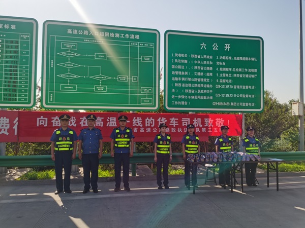 入夏以来,连日高温,货运司机劳累辛苦,高速路政执法职工在治超保畅一线抗高温、战酷暑。7月13日上午9时,总队第三支队按照省路政执法总队的统一部署,启动了以“践行初心使命,坚持人民至上,关爱货车司机,高温敬送清凉,保证身心健康,安全牢记心间”为主题的夏季“送清凉”系列慰问活动。慰问活动分别由两名支队领导带队,兵分两路分别奔赴辖区大货车流量较大的咸铜高速咸阳北收费广场和六村堡收费广场,对150余名高温下辛勤工作的货车司机进行了慰问。