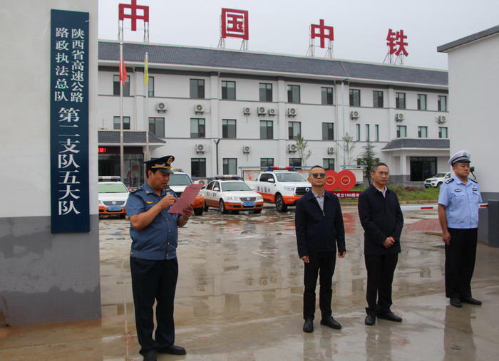 仪式上,副支队长耿智美宣读了省路政执法总队《关于印发<全省高速公路路政执法队伍改革实施方案>的通知》,支队负责人、副支队长张录勤,陕西旬凤韩黄高速公路有限公司旬凤分公司党工委书记、董事长巨勇为五大队揭牌。大队负责人赵琪作了表态发言。