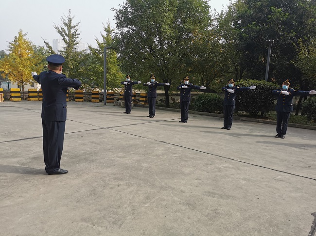 二是强化军事训练。组织全体执法人员在西安绕城分公司大院进行队列实操实训和交通指挥手势训练。