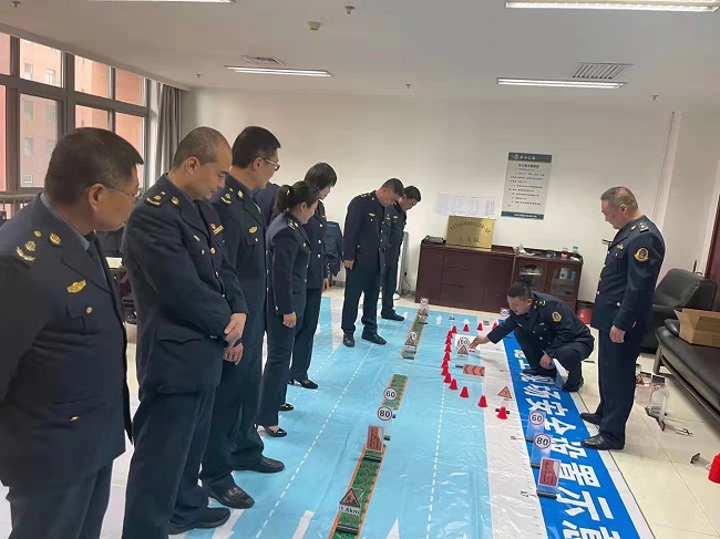 三是扎实做好安全生产工作。强化安全生产红线意识和底线思维,在确保巡查车辆和巡查人员安全的前提下,加大对管辖高速公路路面、匝道、桥梁、施工作业区域路段的巡查力度。近日,八大队联合七大队进行了模拟公路施工现场作业实训演练,向执法人员详细讲解了高速公路施工作业控制区标志、标线和指挥员的布置标准,指出注意事项,并针对日常工作中遇到的实际问题展开热烈讨论。