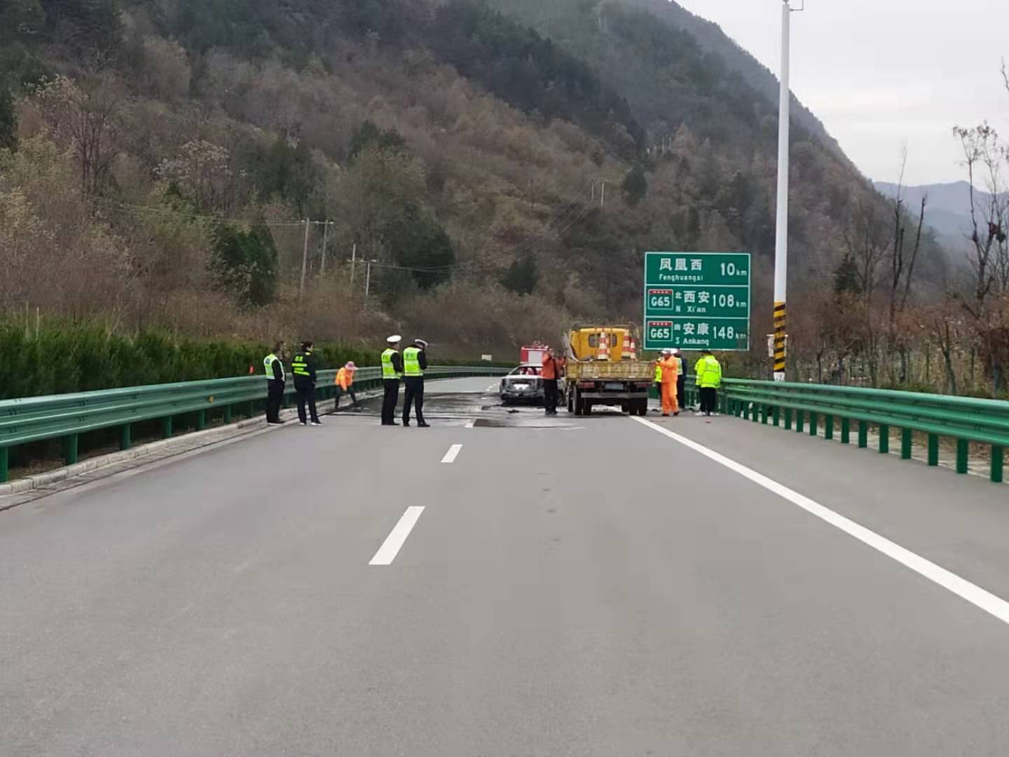 11月11日下午14时许,省路政执法总队第十支队六大队巡查至S30水阳高速K52+100米处,发现前方一辆小轿车撞上护栏起火。高速路政执法人员当即停车查看发现:车辆冒着浓烟,左前轮左后轮均已起火,大火借着风势不断蔓延,起火点靠油箱很近,如不及时处置,极易造成爆炸危险。见此险情,六大队路政人员立即将司乘人员疏散到安全区域,并开启巡逻车辆双闪警示灯,摆放反光锥桶、三角警示牌等,实施临时管制,预防二次事故发生。同时紧急联系消防和交警、养护等部门支援。