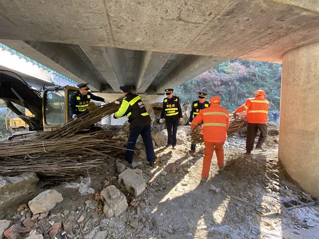 11月5日,一大队联合恒口示范区城市管理综合执法大队、秦岭生态环境保护办公室、自然资源管理局、高明村村委会等部门拉开桥下空间治理的序幕。整治首日,对包茂高速安川段G65-K1099+800m至G65-K100处桥下空间堆放2000余方石料限期清理,后期将加强监督,全面巩固整治成果,坚决防止违法行为反弹。