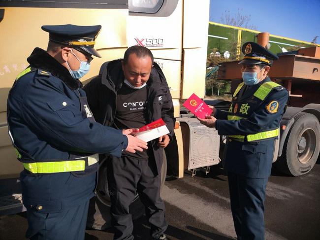 图为总队第一支队五大队路政执法人员向司机讲解宪法知识
