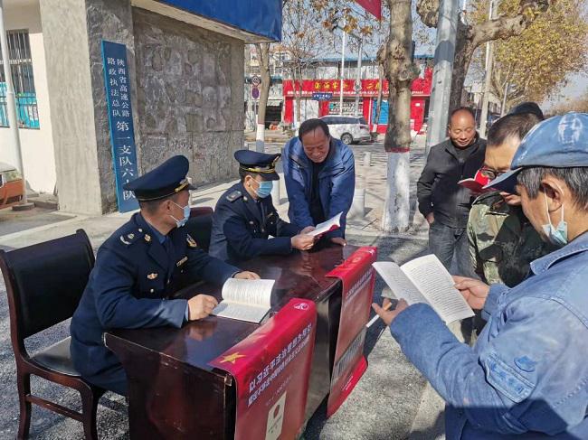 图为总队第一支队六大队路政执法人员向过往群众宣传宪法