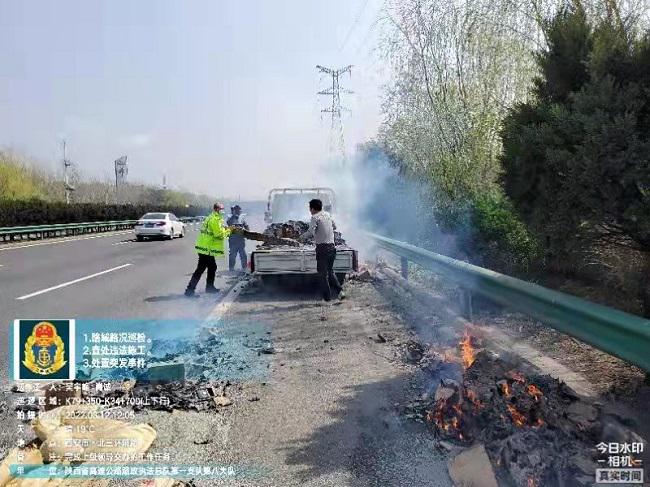 3月12日,省路政执法总队第一支队八大队路政执法人员巡查至西安绕城高速内环方向杏园收费站至谢王立交之间K8+200处时,发现一辆满载聚乙烯的小型货车车厢冒起浓烟并伴有明火。
