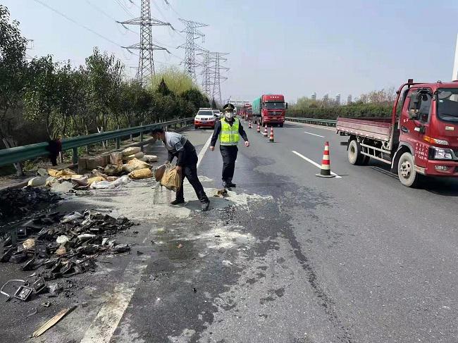 八大队路政执法人员立即拉响警报用喊话器提醒司机,指挥该车在应急车道靠边停车。两名路政执法人员迅速行动,默契配合,分工协作,拨打119报警电话报告火情,同时在后方摆放锥桶疏导交通,严防二次事故的发生,并通知绕北路产安全股;同时,拿起执法巡查车上的灭火器冲向已经腾起火焰的小货车,和司机一起迅速控制住火势,扑灭明火,并将还在冒烟的货物徒手拉下车厢进行分离。随后,消防队和绕北路产安全股人员及时赶到现场,进行后期处置。此次灭火救援行动反应迅速,多方联合处置得当,将损失降到最小,保证了车辆和人员安全,确保了绕城高速安全畅通。