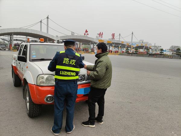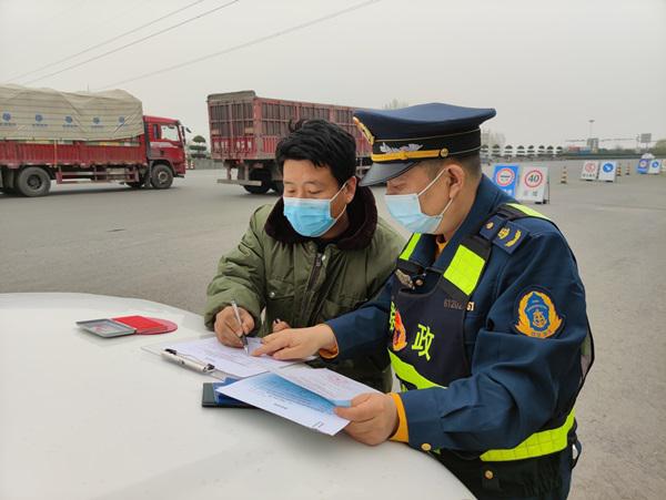 3月17日,省路政执法总队第三支队六大队两名执法人员前往六村堡收费站对在陕西省境内无超限运输车辆通行证行驶涉嫌超限超载车辆进行现场制作法律文书。