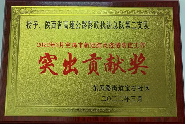 4月14日,在宝鸡市金台区宝石社区疫情防控表彰大会上,陕西省高速公路路政执法总队第二支队被授予“疫情防控突出贡献奖”。
