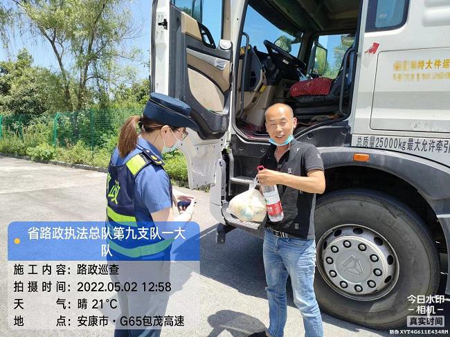 根据该车辆的违法情形,执法人员责令当事人必须办理《超限运输车辆通行证》,改正违法行为后方可继续行驶。但由于节假日不在办理工作时间内,车辆停放在检查站,当事人就餐困难。当天,执法人员及时为当事人送去食物,并与检查站协调当事人食堂用餐事宜,解决了当事人的后顾之忧。5月5日,当事人在办理《超限运输车辆通行证》后,执法人员在协调安康机场收费站后护送大件运输车辆从超宽车道驶出至审批路线的入口收费站安康收费站进入,消除了违法状态。整个执法过程中,执法人员规范执法并热情服务,得到了当事人的认可及肯定。