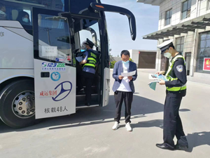 在汽车站,走上大巴车向乘客们宣传高速路行车必备安全常识和道路轻微事故的处理措施,同时提醒司机切勿疲劳驾驶。