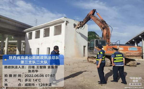 6月6日上午7时,在二大队、七大队联合执法组的现场监督下,当事人对G70福银高速K1794+400太峪互通立交桥下空间违法建筑进行拆除。此次联合行动共出动人员20 余人、机械及车辆 5台,执法车辆2台,经过5小时的不懈努力,将200余平方米的违法建筑物成功拆除。