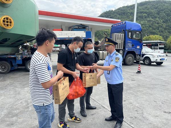 在中秋佳节来临之际,9月9日上午,省路政执法总队第九支队张道革支队长带领相关科室人员专程前往G7011十天高速白河服务区,看望慰问涉嫌违法的大件运输车辆司机及护送人员,为他们送去当地特产双麻饼、水果等慰问品。