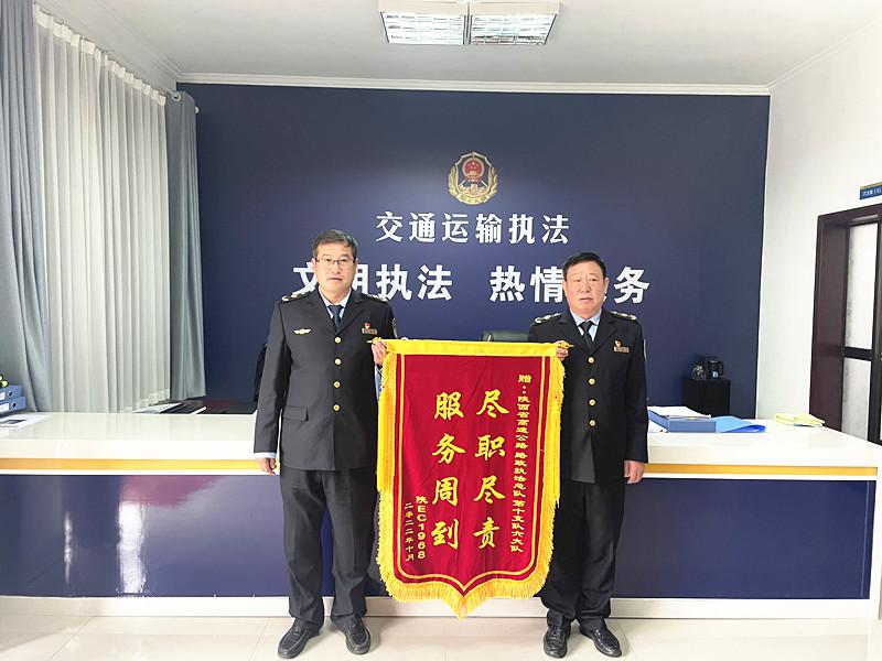 10月25日,渭南合阳县货车司机将一面印有“尽职尽责 服务周到”的锦旗送进了总队第十支队六大队,感谢路政执法人员的贴心帮助和热情服务。