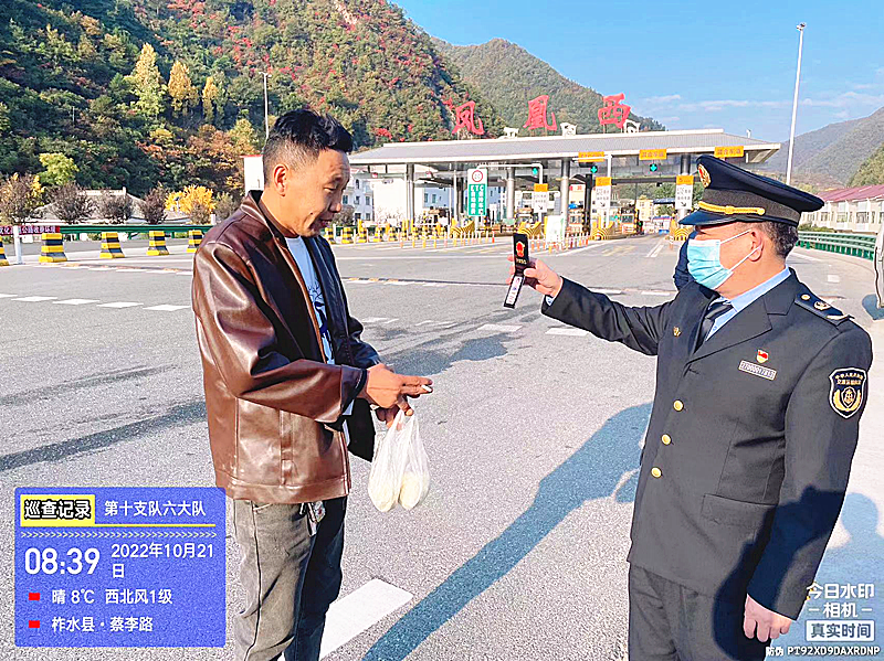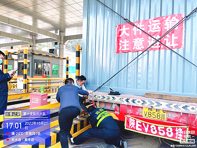 10月21日上午8时许,六大队接凤凰西收费站工作人员通报称有疑似违法超限运输车辆。执法人员闻讯而动,到达现场表明身份后,对该车进行现场勘验核查。经查,涉事车辆车货总重未超过49吨,车货总长18.2米、总宽4.0米、总高3.8米,属于超限运输,且司机因路况不熟未按规定路线行驶。执法人员在调查取证后,按照“重教育、轻处罚”的原则对司机批评教育,责令立即整改,并耐心向其宣讲超限运输车辆通行相关法律法规和违法超限运输的危害,以说理式执法展现了高速路政执法人员的良好风貌。因疫情防控,当事人就餐不便,执法人员主动为其送上食品和水。得知当事人对申请大件运输通行证流程不熟悉,执法人员又不厌其烦多次演示,直到重新办理的证件审批后才依法放行车辆出站。