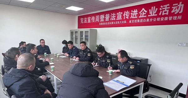 加强宪法宣传,确保活动成效。通过走进机关、农村、社区、企业,制作宣传视频、发布宣传挂图等方式深入开展宪法宣传,四大队深入佐龙村和沿线企业,送去法律书籍,并用通俗易懂的语言,为群众解疑释惑,让宪法更加深入人心,推动全面贯彻实施宪法;六大队联合安康管理所开展宪法宣传周暨普法宣传进企业活动;九大队联合平利管理所到平利县西河镇开展宪法宣传活动。