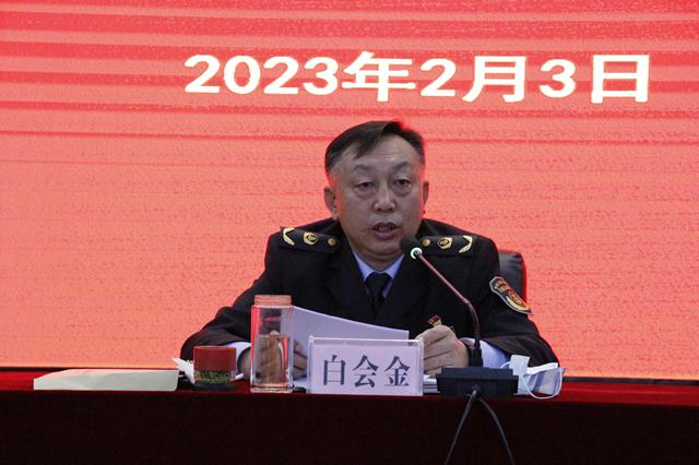 总队纪委书记白会金在讲话中对支队2022年高速路政执法工作取得的成绩给予了充分肯定,就做好2023年高速路政执法工作提出5点要求:一是提高站位,精心抓好党的二十大会议精神学习宣贯。要充分认识党的二十大的重要意义,深刻学习领会,准确把握党的二十大精神实质和丰富内涵,按照厅党组和总队党委的部署安排,对标党的二十大提出的新思想、新论断,作出的新部署、新要求,把学习宣贯党的二十大精神贯穿路政执法工作始终,狠抓宣贯执行,以实际行动推动党的二十大精神落地落实。二是凝心聚力,全力推动高速路政执法高质量发展。深入推进执法规范化建设,依法履职尽责,厚植为民情怀。加强协作配合,树立交通一盘棋的思想,积极探索和深化一路多方协作机制。三是多措并举,切实加强高速路政执法队伍建设。加强领导班子建设,严格落实民主集中制,增强大局意识,团结意识。加强执法队伍的培训教育,强化执法人员理想信念教育和执法业务培训,不断提升人员思想政治素质、业务能力和工作水平。四是筑牢防线,扎实做好安全生产各项工作。加大对高速公路、公路用地、建筑控制区、桥隧安全保护区的监管力度,重点部署汛期、冬季雨雪冰冻等恶劣天气条件下的安全监管,强化隐患治理,健全长效机制,严防高速公路重特大安全事故发生,保障行业和谐稳定。五是全面从严,推动党建和党风廉政建设向纵深发展。深入贯彻新时代党的建设总要求,加强思想政治建设,严格落实中央八项规定精神,驰而不息纠治四风。