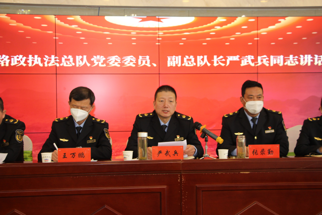 严武兵副总队长在讲话中充分肯定了第二支队2022年工作取得的成绩,就做好2023年工作提出以下五点要求:一是提高站位,精心抓好党的二十大精神学习宣贯。要充分认识其重大意义,准确把握精神实质和内涵,结合路政执法工作实际,围绕“5个聚焦”,认真组织各类学习宣讲及培训活动,切实把党的二十大精神转化为推动工作的强大动力。二是凝心聚力,全力推动高速路政高质量发展。要深入推进执法规范化建设,认真落实行政执法责任制,树牢“执法即服务”理念,以办好人民满意交通为目标,严格落实行政执法“三项制度”,深化“四基四化”建设,积极探索和深化“一路多方”协作机制,为加快建设交通强省提供有力的执法保障。三是多措并举,切实加强高速路政执法队伍建设。要严格落实民主集中制,加强领导班子建设,形成团结一心干事业的工作合力;按照“提能力、强素质”的要求,分级分类开展好教育培训,锻造一支政治坚定、素质过硬、纪律严明、作风优良、廉洁高效的高速路政执法队伍。四是筑牢防线,扎实做好安全生产各项工作。要坚决贯彻落实省委、省政府和省厅决策部署,按照“三管三必须”和“分片包抓”、“包保责任”等要求,对照问题隐患,实行闭环销号整改;夯实各级责任,加大高速公路、桥隧安全保护区等重点区域汛期及雨雪冰冻天气安全监管,严防安全事故发生。五是全面从严,推动党建和党风廉政建设向纵深发展。要常态化推进党史学习教育,全面推行党支部“1421”工作法,严肃党内政治生活,抓好党支部标准化规范化建设。扎实开展“干部作风能力提升年”活动,推进作风建设常态化长效化。大力开展文明单位创建,践行社会主义核心价值观,多渠道培树先进典型,打造特色文化品牌,传递高速公路路政执法正能量。