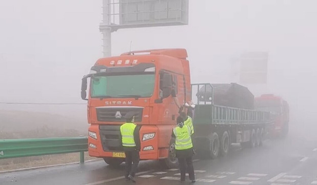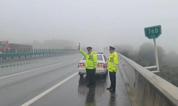 在长大陡坡、易发生团雾路段安排执法人员做好指挥疏导,喊话提醒过往车辆减速慢行,注意行车安全。