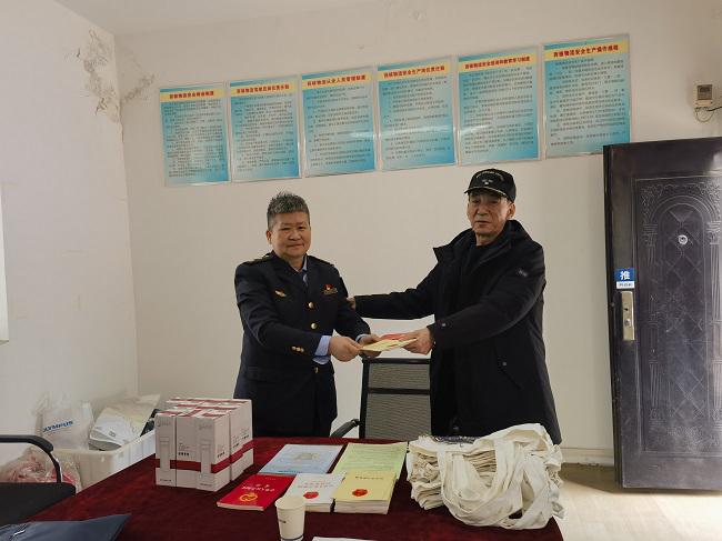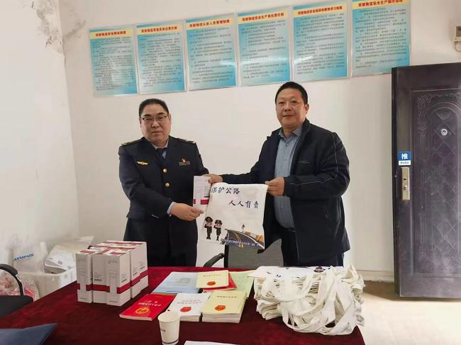 最后,宋瑞林、禄勇民两位副支队长向企业赠送了《宪法》《行政处罚法》《公路法》《公路安全保护条例》《陕西省治理货物运输车辆超限超载条例》等法律法规以及宣传袋、宣传资料等。