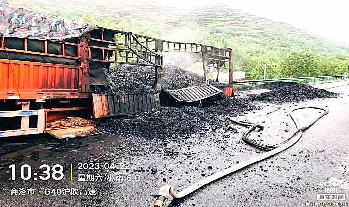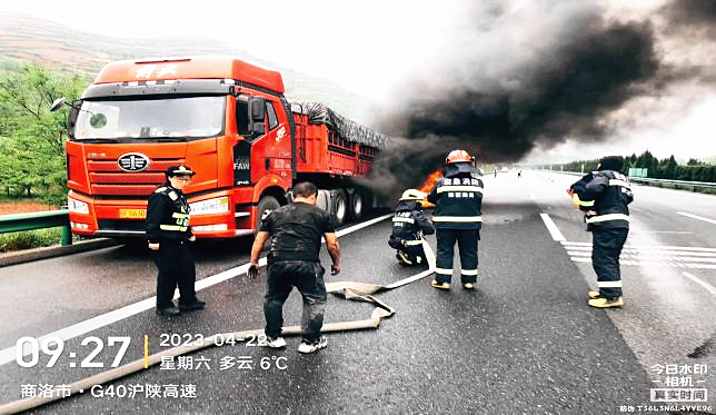 4月22日上午8点45分许,省路政执法总队第十支队二大队路政人员巡查至沪陕高速商界段界牌方向K1388+900m处时,发现一辆后轮胎起火的货车停靠在紧急停车带上。路政人员立即停车查看,在确认货车满载煤炭后,路政人员紧急行动,组织人员灭火,设置警示标志,摆放反光锥筒,鸣笛提提醒过往车辆注意避让减速慢行,同时联系消防、交警等部门请求支援。受施救条件限制,很快货车后部已被浓浓黑烟笼罩,由于事故地点在隧道出口附近,极易发生二次事故,现场情况十分危急。在消防人员到达现场采取扑救措施后,路政人员协助交警部门对现场进行临时交通管制,做好安全防护。