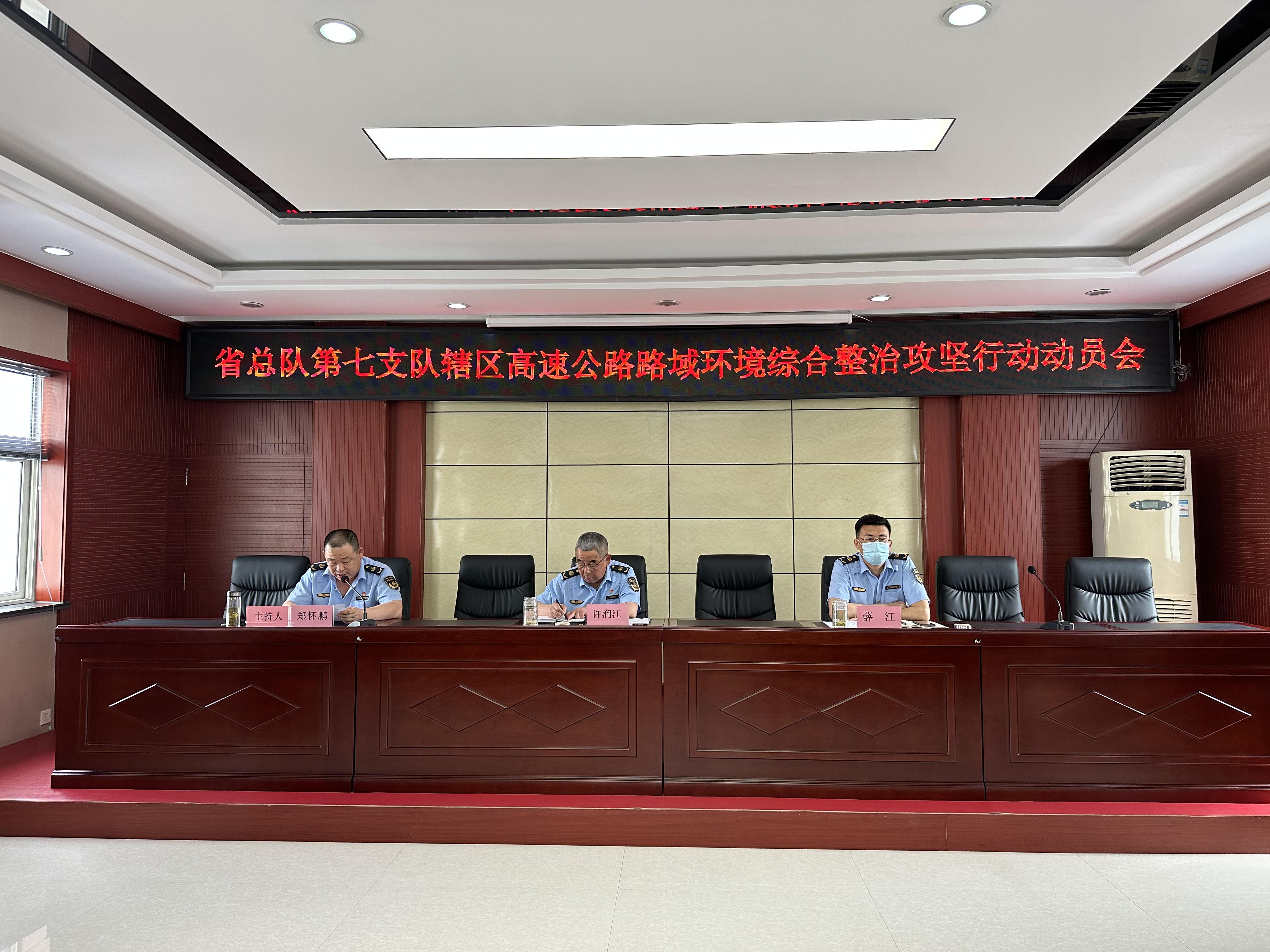 会议由副支队长郑怀鹏主持,副支队长薛江宣读了《陕西省高速公路路政执法总队 陕西交通控股集团有限公司运营管理分公司关于开展全省高速公路路域环境综合整治攻坚行动的通知》,支队长许润江作动员讲话,九大队负责人代表各大队作表态发言,榆吴分公司安全路产大队李向荣代表各运营公司路产管理部门作表态发言。