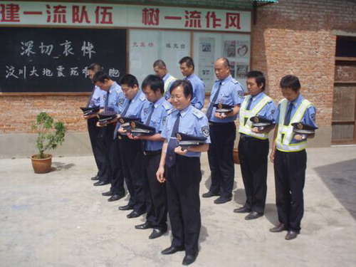 5月19日14时28分,延安姚店超限运输检测站检测场地警报声大作,全体职工为汶川大地震中罹难的同胞默哀。